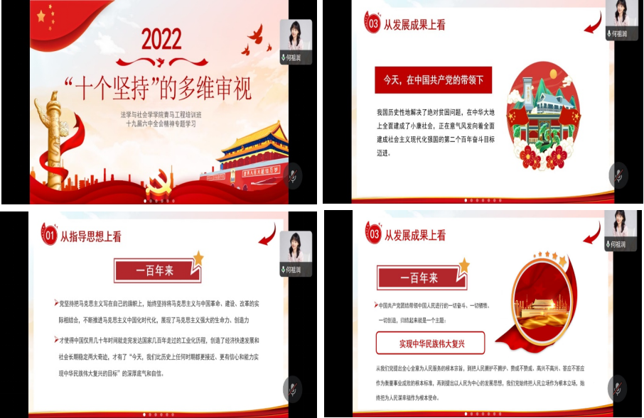 3月28日12:30,由学院分团委书记何祖润老师为学员们带来十九届六中全会精神专题学习,分别从思想指导、自身建设、发展成果等三个思维理路全面阐述党的百年奋斗中“十个坚持”的多维审视,宣讲中国共产党奋斗百年取得光辉历史的宝贵经验。同时,何祖润老师从百年未有之大变局、马克思主义、大学生骨干的素质特征等多个方面分别论述青马工程对新时代大学生的重要意义。