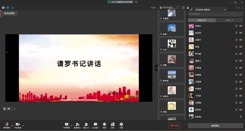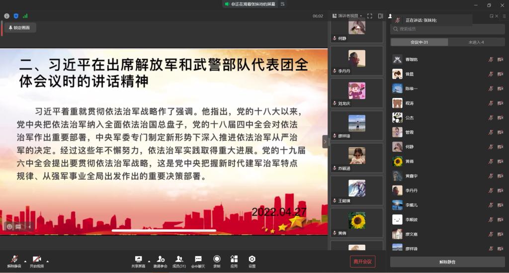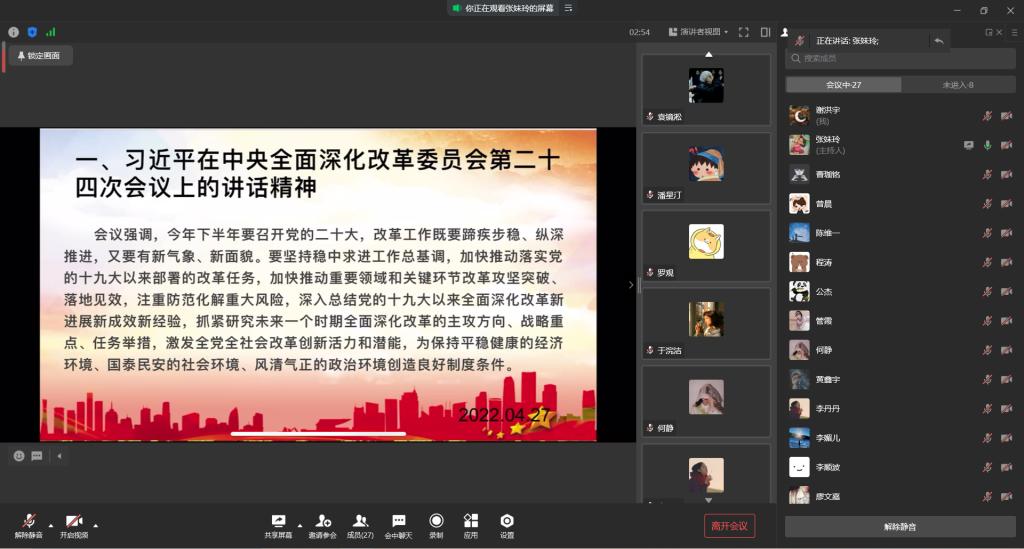 太阳成tyc234cc学生一支部于2022年4月27日19:00在企业微信开展了2022年四月线上组织生活会。本次会议由张妹玲同志主持,支部全体党员参与。