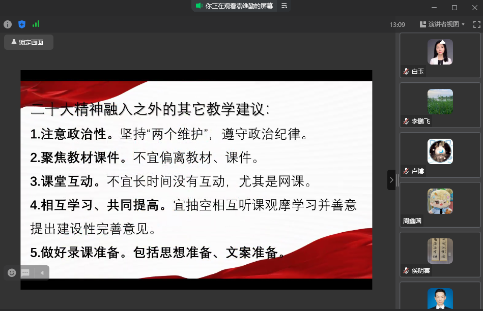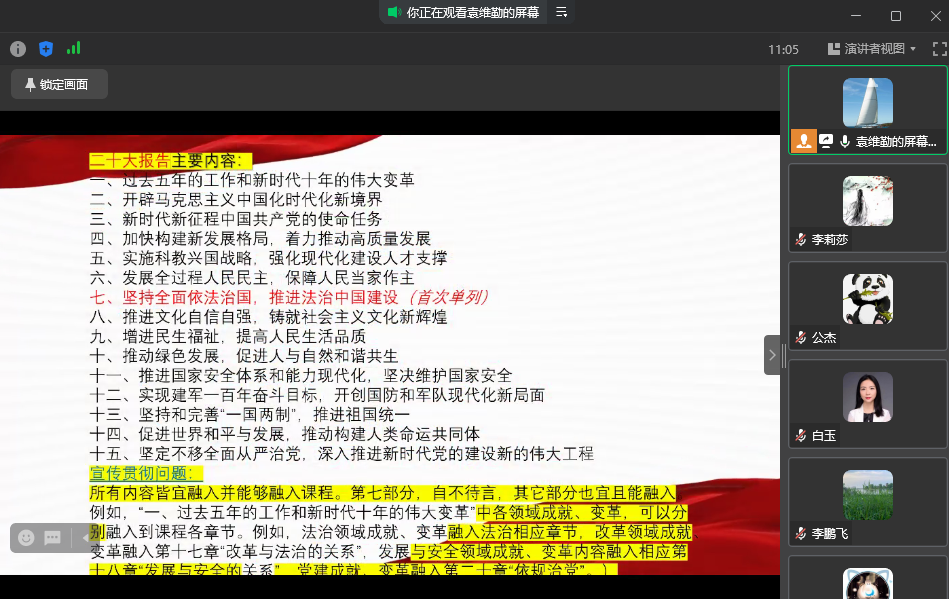 会议第一阶段为团队交流。袁维勤介绍了此次研讨会目的是把二十大精神切实贯彻到课程教学中,他领学了二十大的主题及主要内容,提出了《习近平法治思想概论》团队教学融入二十大报告需要注意的问题,分享了五点教学建议。教学团队成员李鹏飞博士、卢博博士、白玉博士分别分享了自己融入原有审判纪检工作、法理学专业、经济法专业到各自课程教学中的有益尝试,教研团队成员、教工一支部书记焦海洋分享了课程政治性与理论性结合的尝试,法学系主任公杰建议团队老师在课程教学中适当引导学生在专业方向分流中的认知。会议第二阶段是院领导提工作要求。侯明喜说,“习近平法治思想”教研团队是实的而非虚的,下一步宜统一课件、完善考核机制,他结合自己的教学经历,建议团队引导学生查找、抄写习近平法治思想论述原文并通过师生共享激励学生。院长黄文也是团队成员,他肯定了团队现有工作,并希望团队踔厉奋发,做出品牌。李莉莎提出了四点要求:一是要提高政治站位,把二十大最新精神、成果落实到课程教学中;二是要坚守意识形态红线,注重政治性与思想性的统一;三是要发挥多学科参与优势,创新教育教学方法;四是要创新教学方法,实现“四真”即学生真听、真懂、真领会、真执行。