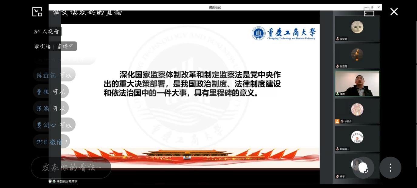 之后,在律动青年法学社、大学生廉洁文化研究会联合举办的“公生明,廉生威”廉洁文化线上宣讲活动中,重庆廉洁研究中心研究员、太阳成tyc234cc法学系教师李鹏飞担任主讲人,线上参与活动人数超过240人。李鹏飞以《中华人民共和国监察法》为切入点进行讲解,从真实案例、实际工作经验出发,引导同学们充分认识制定《监察法》的意义,进一步感受廉洁文化的熏陶,深化廉洁文化对在校大学生的影响。