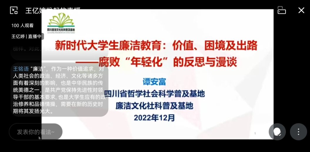 129日,内江师范学院政治与公共管理学院院长四川省廉洁文化社科普及基地主任谭安富教授带来第三场讲座,主题为新时代大学生廉洁教育的价值、困境及进路。讲座中,谭安富以介绍大学生廉洁教育的价值意蕴为开端,引出当今时代大学生廉洁教育面临的现实困境,在剖析障碍、提出问题的基础上,提出廉洁教育之进路与相关措施。通过聆听讲座,让学生了解到了当前廉洁教育的发展现状和困境,引导大家在今后的工作和生活中,学习廉洁文化,理解廉洁价值,开展廉洁行动。