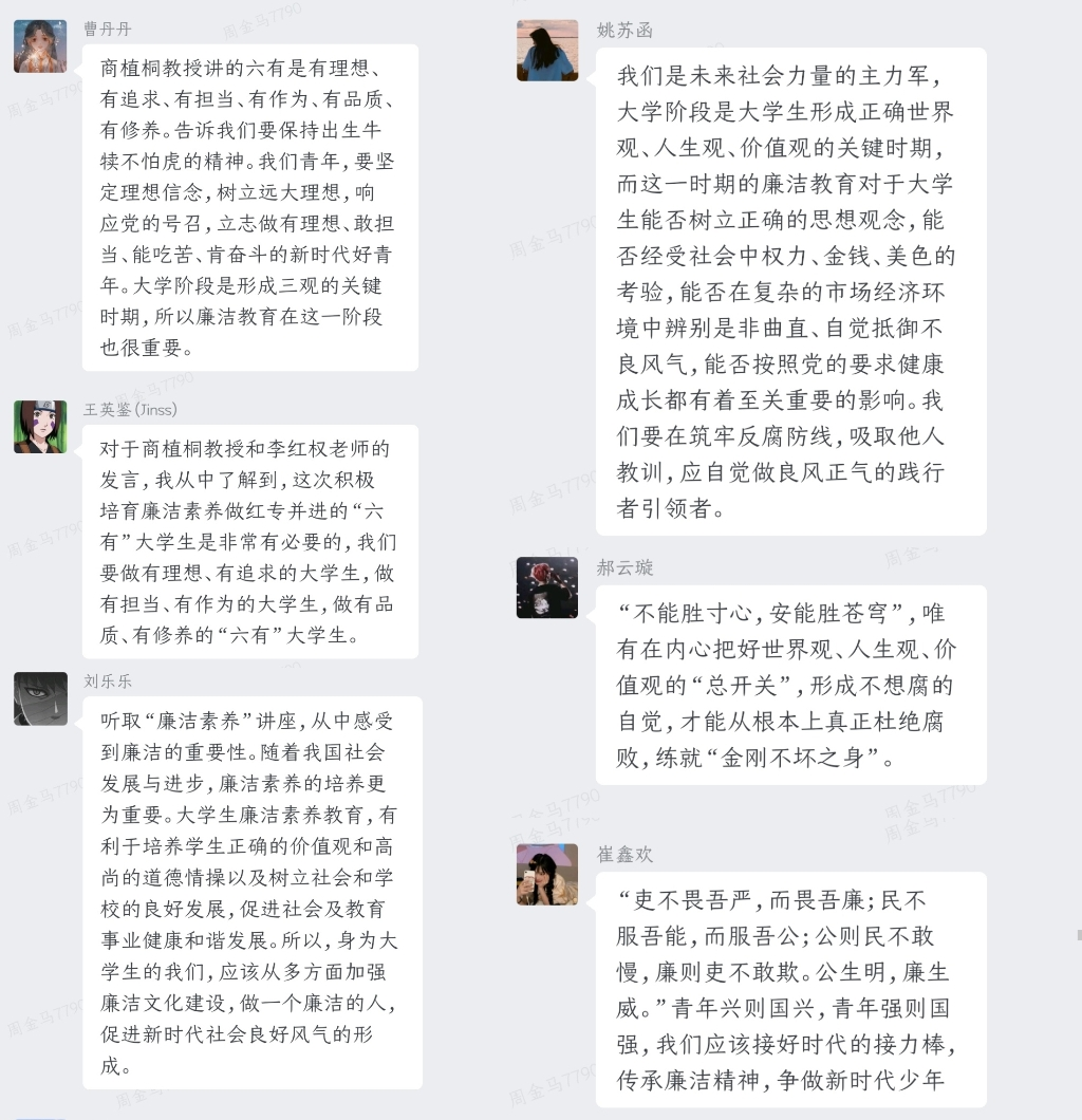 讲座结束后,同学们积极在交流群中发表自己的感想,不少同学表示要做有理想、有追求的大学生,高扬理想信念的旗帜,面对迥然不同甚至截然相反的思想、观念和价值时,真正做到千磨万击还坚劲,任尔东西南北风