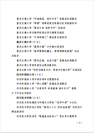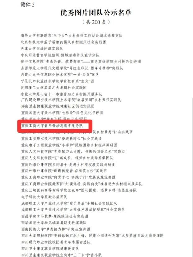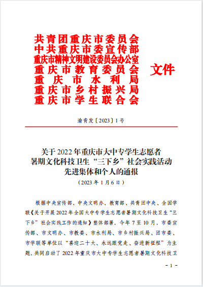 经材料审核、校级推荐、综合评审等环节,市委宣传部、市文明办、市教委、市水利局、市乡村振兴局、团市委、市学联对我院青年普法志愿者服务队予以通报表彰,授予2022 年重庆市大中专学生志愿者暑期文化科技卫生“三下乡”社会实践活动“优秀团队”称号。
