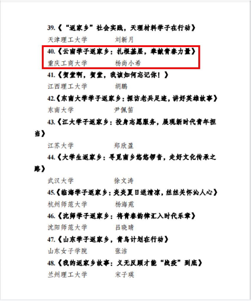 经报名审核、作品发布、网络展示、综合评审等环节,在共青团中央青年发展部、中国青年报、中国青年网共同举办的2022年“镜头中的三下乡”征集活动中,我院青年普法志愿者服务队荣获“全国优秀图片团队”奖项。在共青团中央青年发展部、中国青年报、中国青年网共同举办的2022年“我的返家乡实践故事”征集活动中,2020级社会学专业杨尚小希作品《云南学子返家乡:扎根基层,奉献青春力量》荣获全国优秀作品。