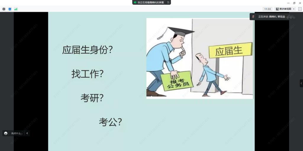 会议第一阶段,学院特邀辅导员魏楠航老师为毕业生作就业政策宣讲。魏楠航老师以“毕业季,应届生的那些事”为题,从应届生的定义、应届生身份的运用范围、应届生需明白的事、职业规划等四个方面向同学们做了详细讲解,鼓励同学们重视应届生身份,抓住春招机遇尽快就业。