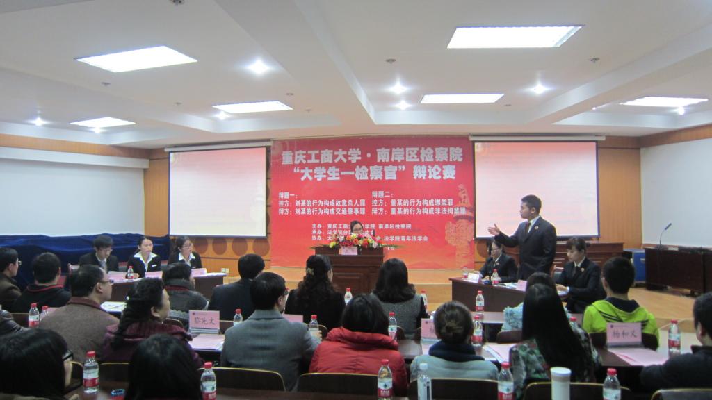 12月4日晚,由法学院和南岸区检察院共同主办的“大学生─检察官”辩论赛”在慧智楼90426模拟法庭隆重举行。南岸区检察院副检察长黎先文、副检察长邹望、纪检组长石斌、政治处主任李朝东、职务犯罪侦查局局长司智虎等一行三十余人,学校宣传部副部长杨维东、学生处副处长李莉莎、校团委副书记杨娟、法学院党总支书记李自维、法学院院长杨和义出席了本次赛事。南岸区检察院侦查监督科科长乔梅、案件管理室主任卢佳以及我校经济学院专任教师朱俊耀、法学院专任教师杨静担任了本次辩论赛的评委。