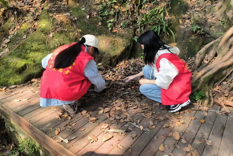 志愿者们顺着栈道逐级而上,将道路两旁的垃圾都清扫干净清扫活动不仅使志愿者们的身体素质得到了锻炼,还让志愿者们深深地感受到了山林清洁的不易,进一步增强了大学生的劳动实践意识