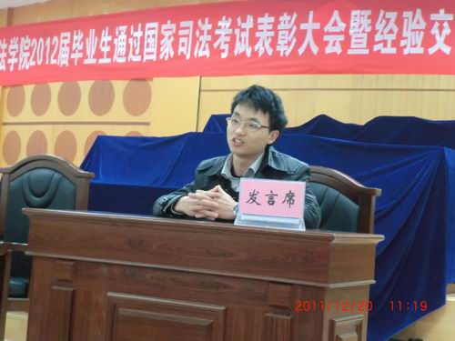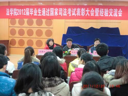 2011年的国家司法考试终于揭晓谜底,法学院2008级学生喜获佳绩,有19人顺利通过考试。12月20日,法学院在慧智楼模拟法庭成功召开2012届毕业生通过国家司法考试表彰大会暨经验交流会。法学院党总支书记杨和义、院长华鹰、08级辅导员林细妹、以及通过2011年司法考试的全体同学和09级同学出席了此次大会。本次大会由党总支副书记李莉莎主持。