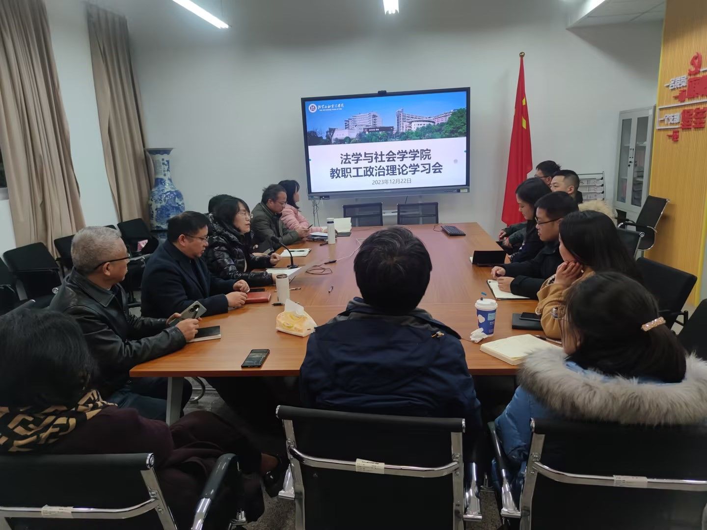 会上,副院长侯明喜对专业监测审核评估、期末考试等近期重点教学工作进行了布置,并传达了学校本科教学工作例会精神;副院长刘勇布置了科研工作,号召老师们按照学校要求认真做好项目申报准备工作,同时对研究生期末考试和研究生就业工作提出了要求;专职组织员陈善国对期末学生考风考纪问题进行了强调。院长黄文通报了“十四五”市级重点学科中期评估、MSW专项验收等工作开展情况,并对申报省部级以上课题、参加学术活动等工作提出要求。党委书记李莉莎传达了学校课程思政工作会以及安全稳定工作会精神,要求老师们开展好教研活动,注重凝炼课程思政元素;同时布置了近期安全稳定工作,要求加强岁末年初各方面安全,坚守意识形态红线,加强师德师风建设;并对就业工作、巡察整改工作进行了布置。