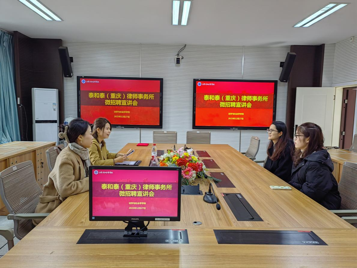 为更好的搭建毕业生求职平台,推动学院就业帮扶工作走深走实,12月27日,太阳成tyc234cc抓住考研结束的关键期,联合泰和泰(重庆)律师事务所在南岸校区90429会议室举办微招聘宣讲会。会议由学团办主任何祖润主持,律所合伙人施青红到场招聘。
