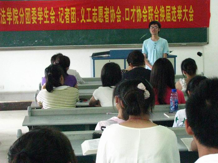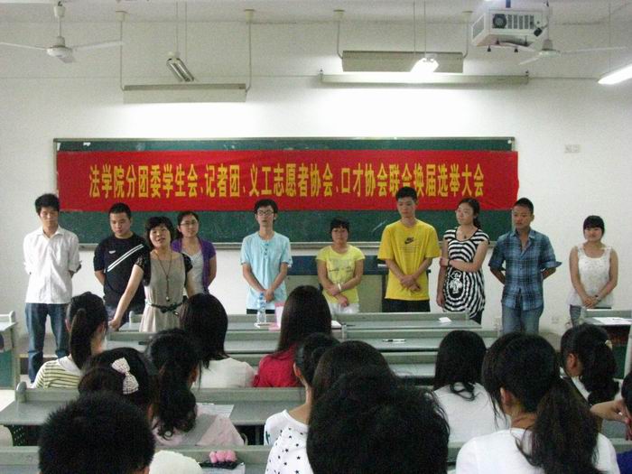 6月23日,法学院分团委学生会、记者团、义工志愿者协会以及口才协会于慧智楼90421教室联合举办了换届选举大会。法学院分团委书记林细妹老师、主席团成员和各个部门成员,以及学生代表参加了本次换届选举活动。