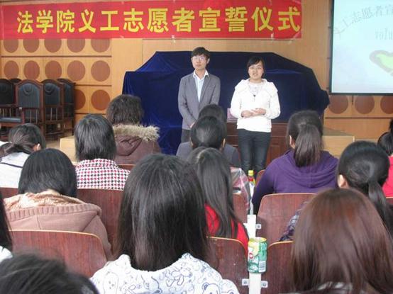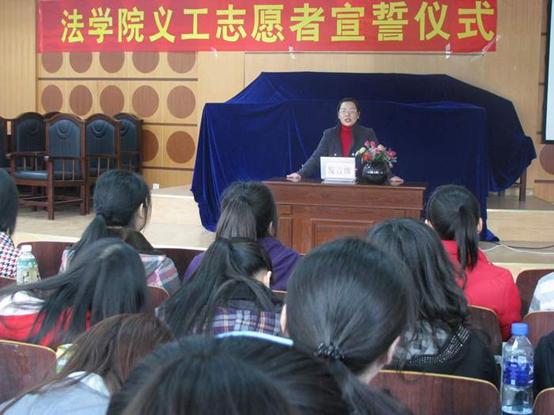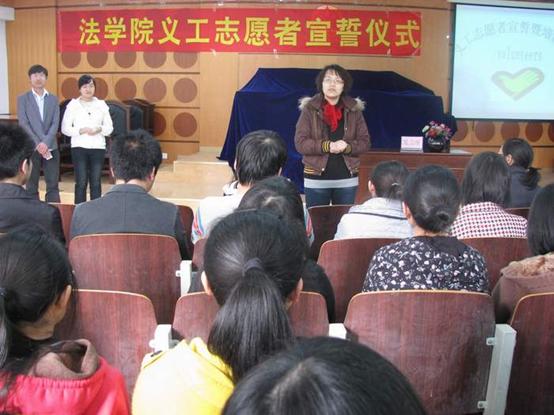 为了进一步提高法学学子服务社会的意识,增强社会责任感和使命感,3月18日下午,法学院义工志愿者协会特邀重庆市血友康复协会彭茂琳会长参加我院在慧智楼90426教室举行的志愿者宣誓仪式,并对我院义工活动的相关注意事项进行了培训和指导。法学院党总支副书记李莉莎老师、辅导员黄河老师以及义工志愿者协会全体成员出席了本次活动。