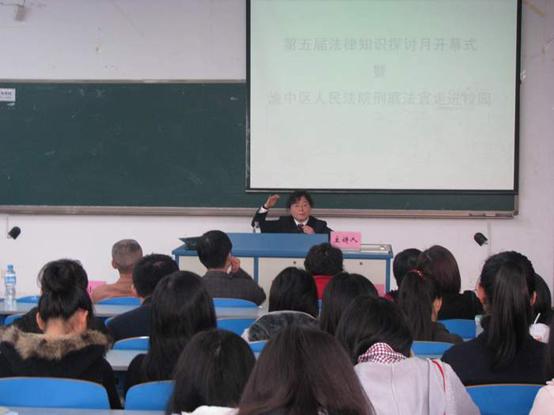近日,法学院在慧智楼90326教室成功举行了“第五届法律知识探讨月开幕式暨渝中区人民法院刑庭法官走进校园”法律活动。渝中区人民法院刑庭庭长向鸣法官、副庭长魏小燕法官、法学院院长华鹰教授、党总支副书记李莉莎副教授、分团委书记林细妹老师以及08级全体同学出席了本次活动。