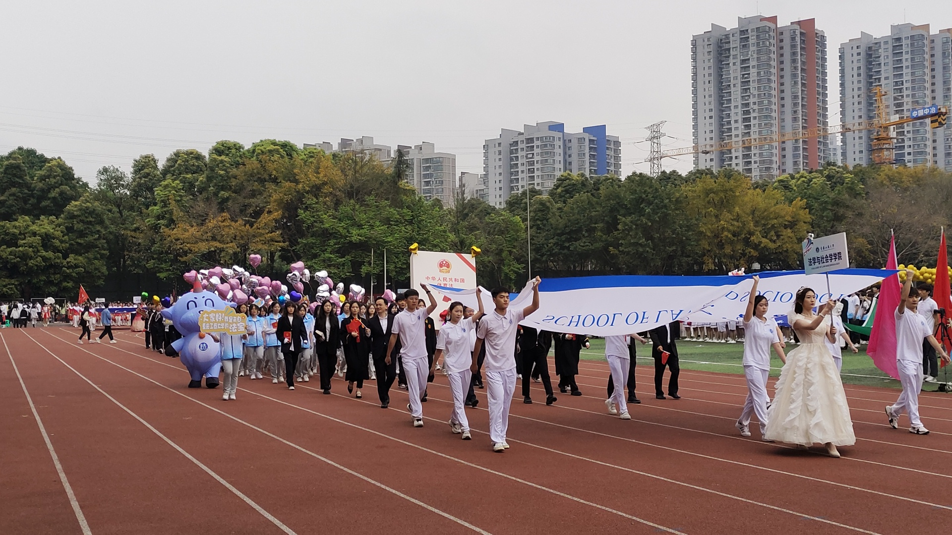 在开幕式的亮相上,我院师生方阵队列充分展现了斗志昂扬的奕奕神采;在戏曲广播体操比赛中,学院代表队动作整齐﹑活力四射,体现了大学生的蓬勃朝气;在啦啦操表演中,队员们青春洋溢、魅力无限,展现了我院学子的青春风采;在南操的茵茵绿场和红色跑道上,法社健儿昂扬向上,奋勇向前,挥洒热血,大家团结一致,分别在团体、个人多个领域为学院赢得了荣誉。