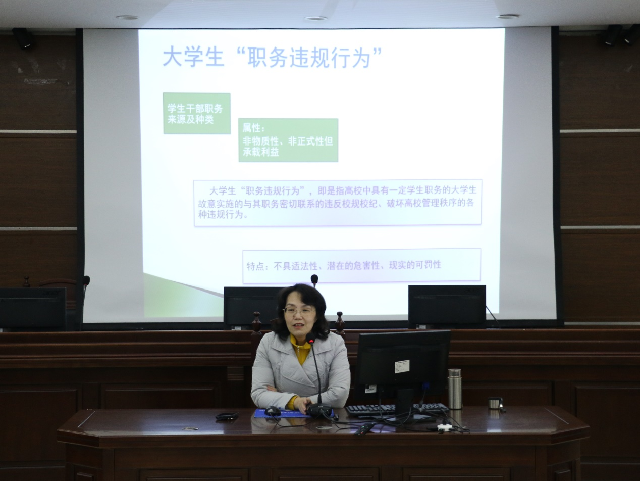 李莉莎以“大学生‘职务违规行为’的廉洁治理思考”为题,通过一个个鲜活的案例,详细分析了其背后的根源,让学生骨干们深刻认识到大学生参与清廉校园、清廉学院建设的重要性。师生共同探讨了如何从思想教育、制度建设、监督机制等多方面入手预防和杜绝此类行为的发生。李莉莎强调要加强廉洁文化教育,将廉洁理念融入学生干部培训的各个环节;建立健全学生组织的规章制度,明确职责权限与办事流程,使各项工作有章可循;形成有效的监督体系,让学生骨干的履职过程置于师生的监督之下,确保权力在阳光下运行。