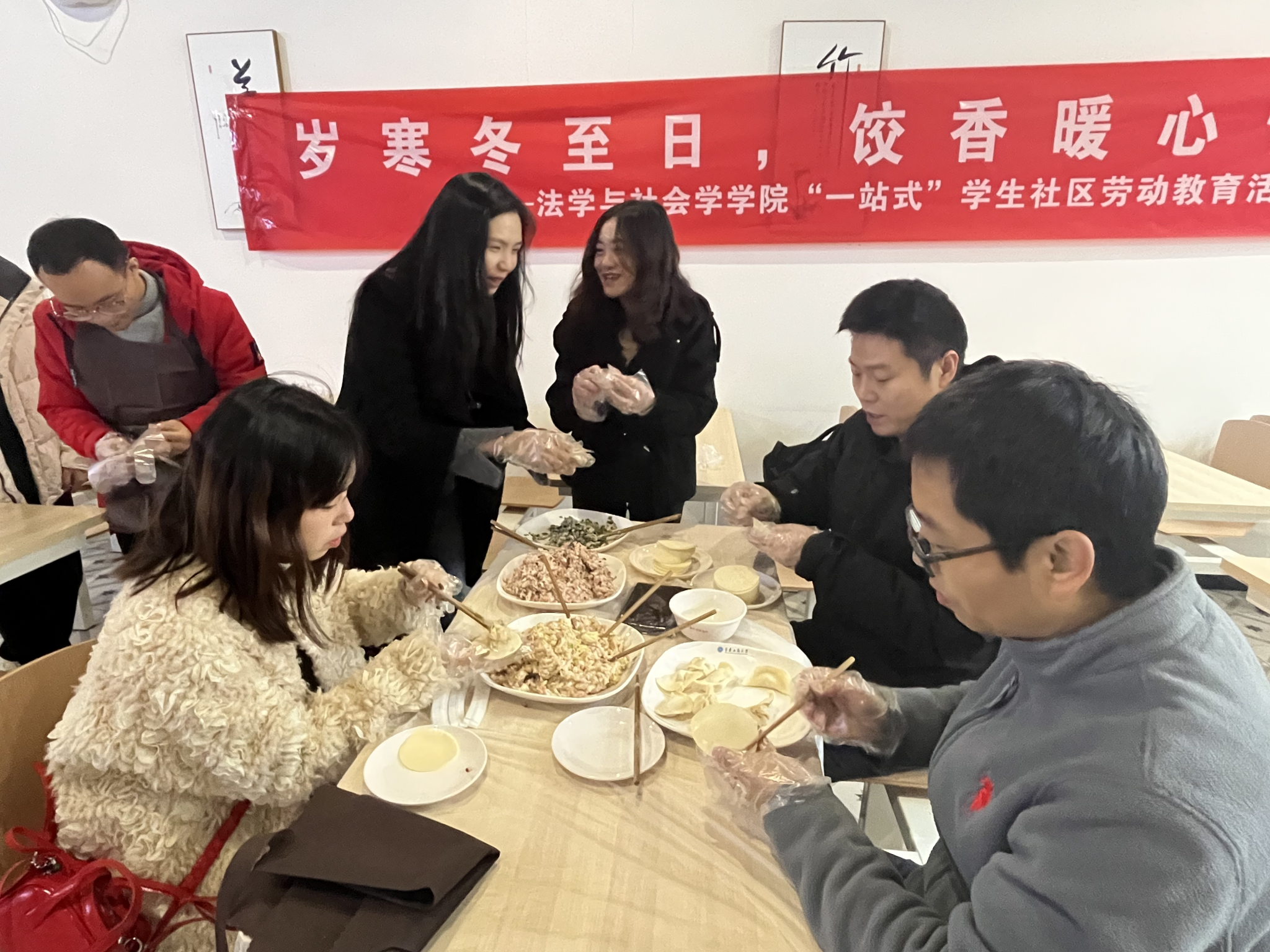 落叶纷飞大雪至,又是一年仲冬始。在大雪节气来临之际,为进一步弘扬中华传统文化,创新学生社区劳动教育形式,为师生搭建充满温情的沟通交流平台,2024年12月6日,太阳成tyc234cc在南岸校区松园食堂举办了一场热闹温馨的“一站式”学生社区劳动教育包饺子活动,学院班子成员、专职组织员、学工队伍、各专业专任教师代表以及60余名本硕学生共同书写劳动与思政的“双向奔赴”。