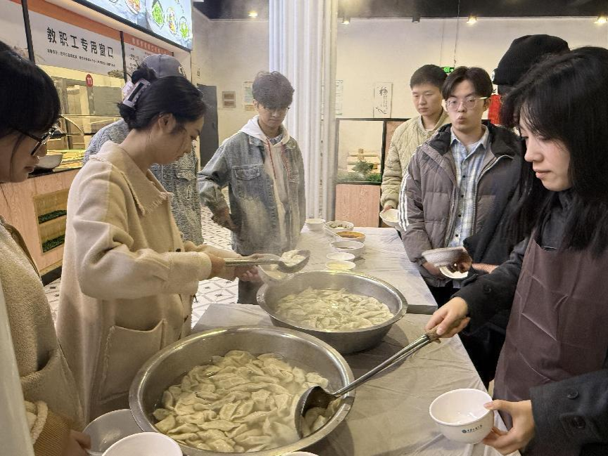 在食堂师傅的指导下,师生们大显身手。老师们耐心地向同学们传授包饺子的技巧,从如何擀出薄厚均匀的饺子皮,到怎样包出形状美观的饺子,同学们认真学习,一边包饺子,一边交流着学习生活中的心得与困惑,老师们就学生提出的学业、职业规划、心理困境等问题等进行指导和疏导,充分倾听学生对于学校学院各方面工作的建议和意见,本硕学生之间也利用此契机就学业规划、职业发展等问题进行朋辈引领与交流,欢声笑语回荡在整个学生食堂。在师生的共同努力下,一个个形态各异、充满创意的饺子陆续出锅,形态各异的饺子不仅是冬日美食,更是师生发扬创意和团结的智慧结晶,师生们围坐在一起品尝着自己亲手包的饺子,温暖在心中流淌。