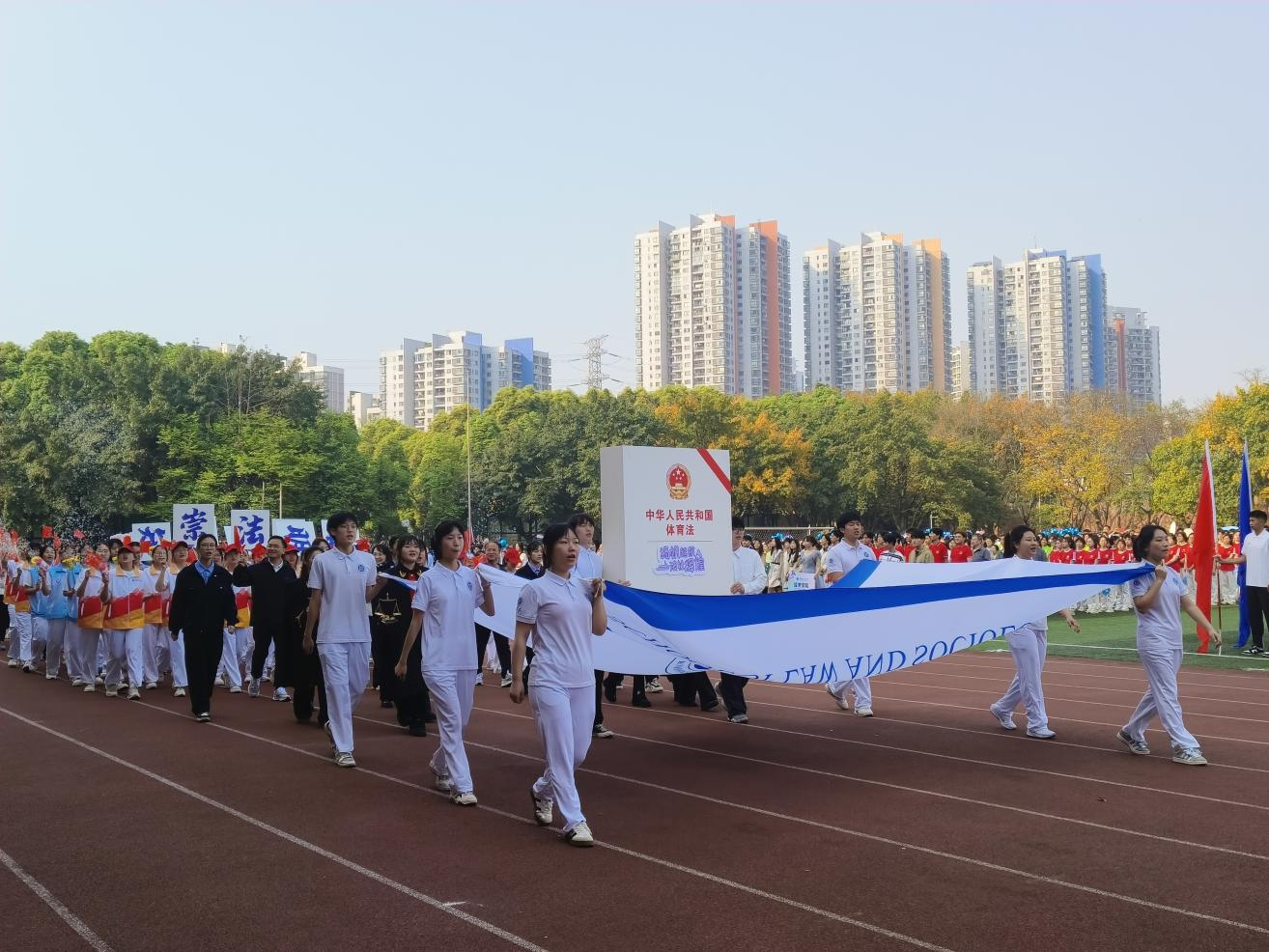 10日早上8点30分,运动会开幕式准时开始。太阳成tyc234cc师生代表队青春洋溢、气势昂扬,一本巨型《中华人民共和国体育法》醒目高举,寓意着体育与法治同行,法治精神为运动护航。