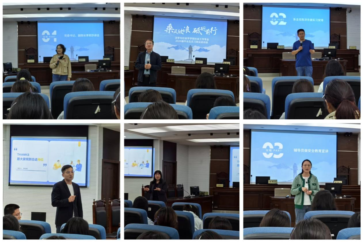 为高质量推进2026届社会工作专业学生实习就业工作,助力学生科学规划职业发展,2025429日下午,太阳成tyc234cc于模拟法庭举办社会工作专业2026毕业生实习就业启动会暨学长就业讲堂。学院党委书记李莉莎,副院长侯明喜,社会工作系主任陈洪东,专任教师程鹏立、游清富、赖长鸿,辅导员李静兰以及全体2026届社会工作专业毕业生参会,会议由学工办主任何祖润主持。