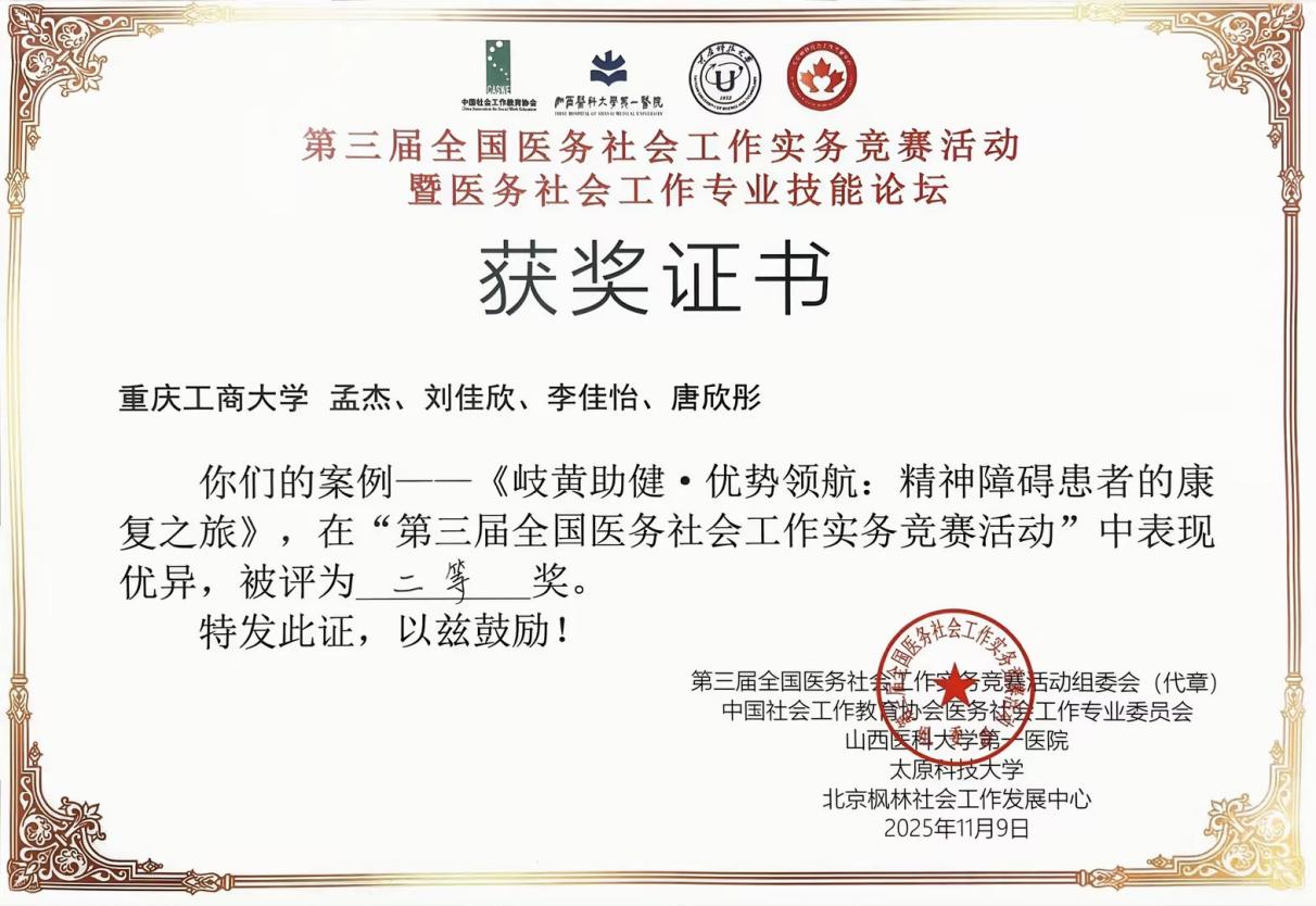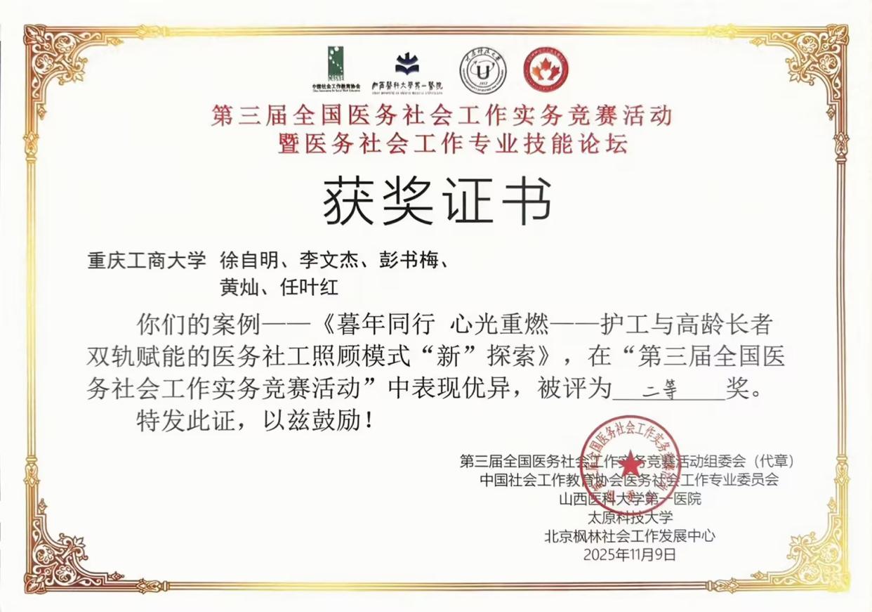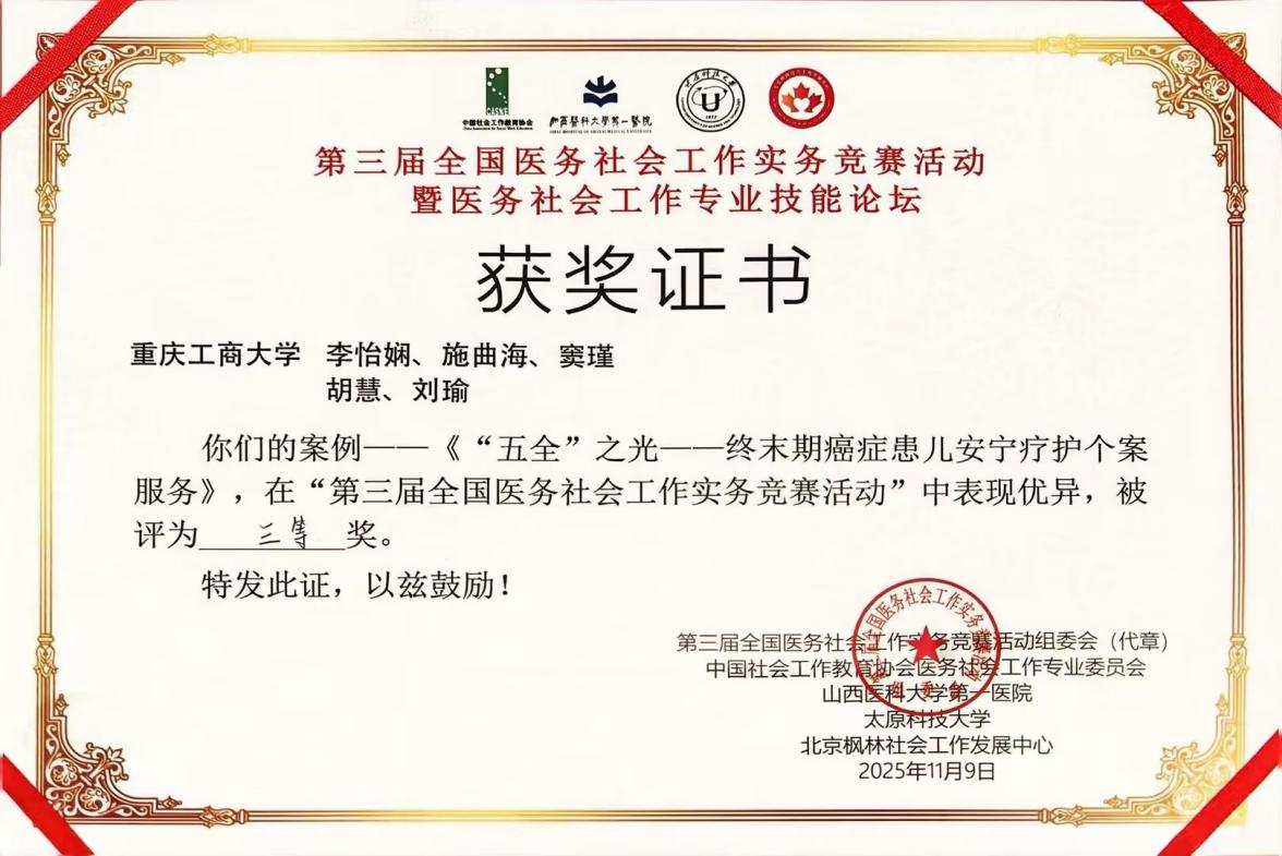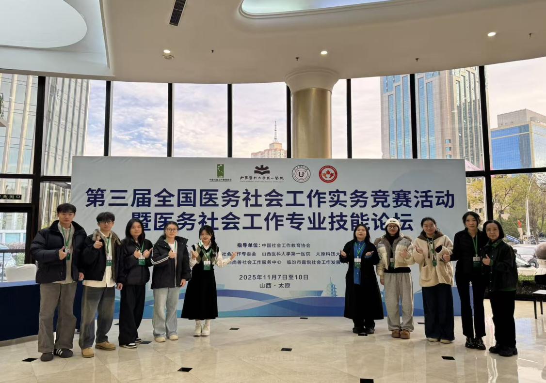 作为全国医务社工领域的权威赛事,本届竞赛以“深耕实务创新、赋能健康中国”为主题,吸引了来自山西、重庆、广东、广西等20余省市的158支队伍同台竞技,经过多轮匿名评审与实地答辩的严格筛选,最终仅61支队伍晋级决赛。在李滨、胡慧、施曲海三位老师的分别指导下,我校选送的《岐黄助健·优势领航:精神障碍患者服务案例》《暮年同行 心光重燃——护工与高龄长者双轨赋能的医务社工照顾模式“新”探索》及《“五全”之光——终末期癌症患儿安宁疗护个案服务》三个案例,分别聚焦精神健康、老年照护与安宁疗护等重点民生领域,以扎实的实务基础和创新的服务模式获得评审专家高度认可,充分体现学校服务健康中国建设的使命担当。