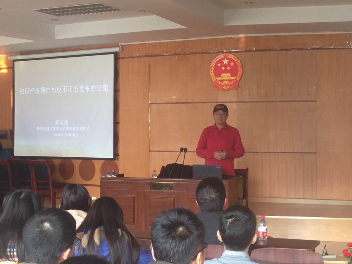 2014年12月19日下午,华中科技大学知识产权博士生导师郑友德教授应邀为太阳集团tyc234cc法学院师生作题为“知识产权与反不正当竞争的交集”的专题讲座。法学院百余名师生聆听了讲座。