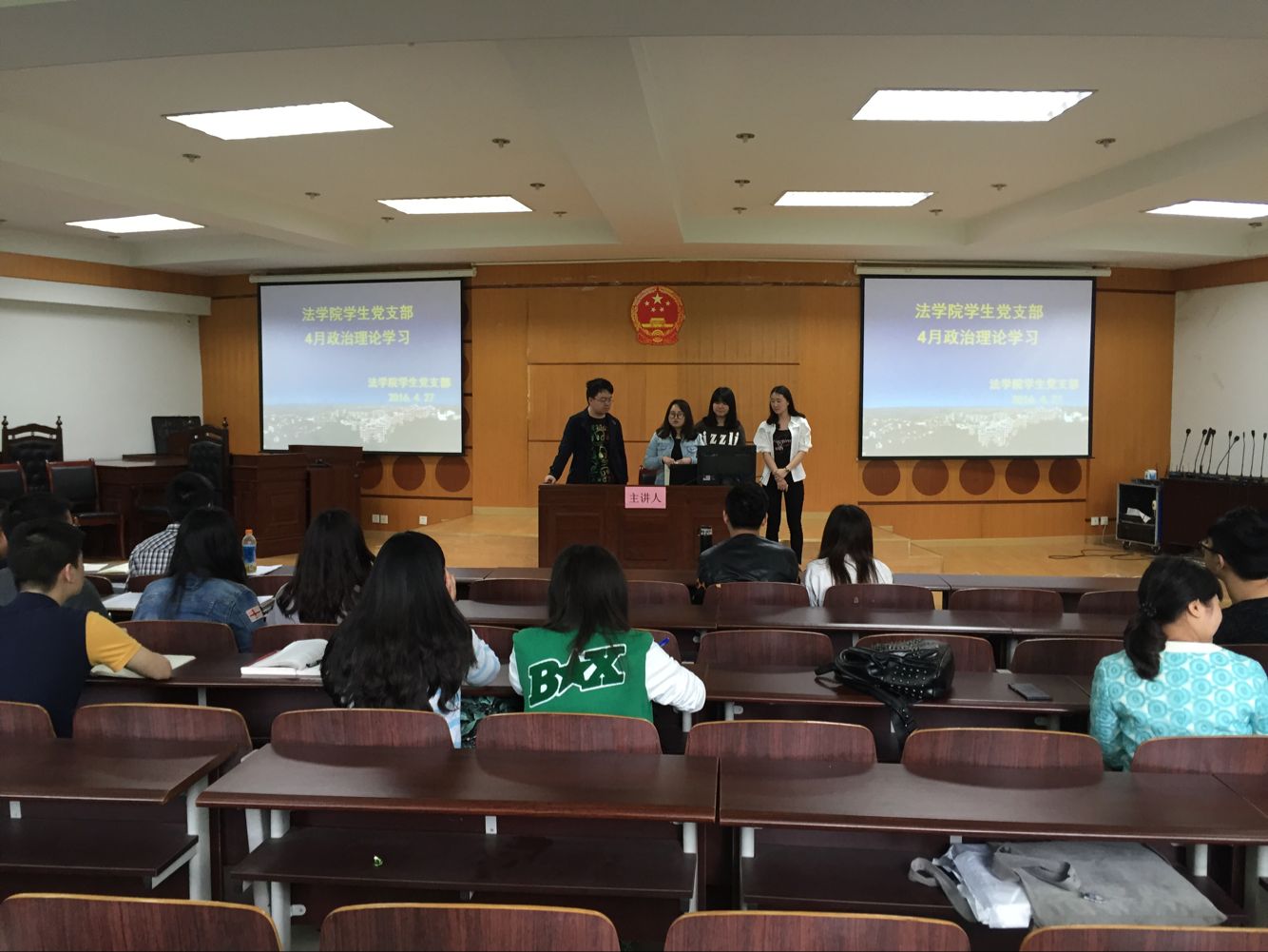 2016年4月26日,法学院学生党支部在慧智楼模拟法庭召开了支部大会,本次会议由学生支部书记杨婷老师主持。