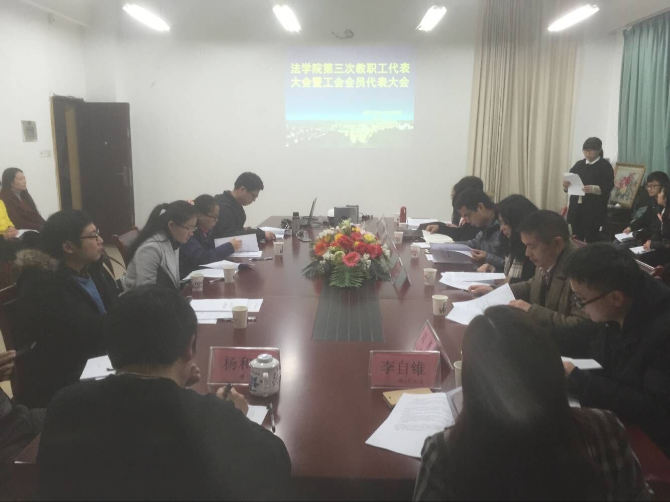 2016年12月23日下午,“法学院第三届教职工代表大会暨工会委员会换届选举工作”在慧智楼90429会议室隆重开幕。各位代表听取和讨论了学院工作报告、听取和审议学院工会工作报告、财务工作报告及工会经费收入情况报告、讨论“专业建设问题”、“关于教学质量的提高”、“关于开放办学”等事宜、通过太阳集团tyc234cc法学院第三次教职工代表大会暨工会会员代表大会执行组成员名单、选举太阳集团tyc234cc法学院第三届教代会、工会委员会以及教代工会经费审查委员会等。法学院党政领导、全体教职工代表、工会会员代表、部分学生代表参加了会议。
