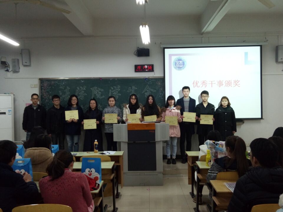 大会的第一项议程为工作总结。学生会主席朱俊丞总结了本学期学生会的工作,他在讲话中表达了对各部门工作成就的肯定,指出了工作中的不足并表明了对未来工作的规划,希望全体成员继续以朝气蓬勃的面貌积极对待今后工作。随后副主席汪陆、刘雪梅、张亚玲分别对所分管部门的工作进行了汇报,详细地总结了这学期丰硕的工作成果,如我院微博的认证与微信公众平台的成功创建等。同时也表达了对部长及干事们的认可与赞赏,希望部长与干事之间应加强沟通、携手并进。大会第二项议程为颁奖,主席团成员为获奖的同学颁发奖状。冉青霞、肖伟、何熙钰等八位干事获得“优秀干事”称号。优秀干事代表何熙钰发言,她认为进入学生会受益匪浅,并表达了在今后工作中更加勤勉从事的决心。随后为“优秀部长”与“优秀部门”颁奖,获优秀部门奖的为宣传部和体艺部;熊航、罗森美、孙丽娟获“优秀部长”称号。主持人在颁奖之后依次采访了各位部长,部长们表达了对干事的鼓励、祝福与殷切期望。大会的最后一项议程是分团委副书记郭芳发表总结性讲话,她表达了对各部长与干事的感谢,并祝愿大家期末考试顺利。最后主持人张亚玲代表主席团向全体成员致以节日的祝福与诚挚的感谢并宣布了此次大会的圆满结束。
