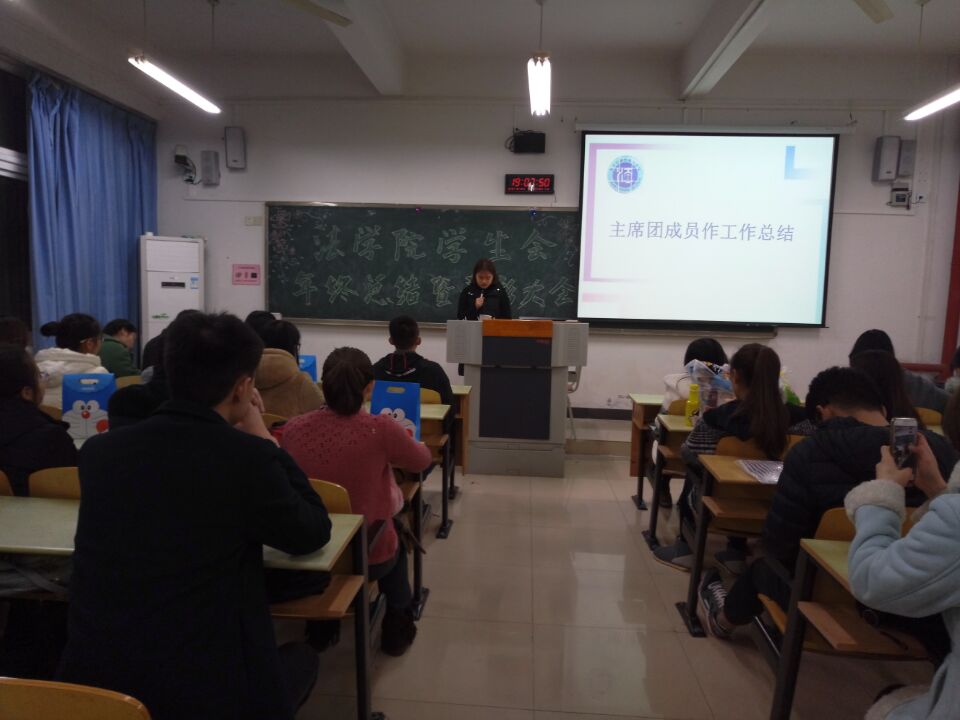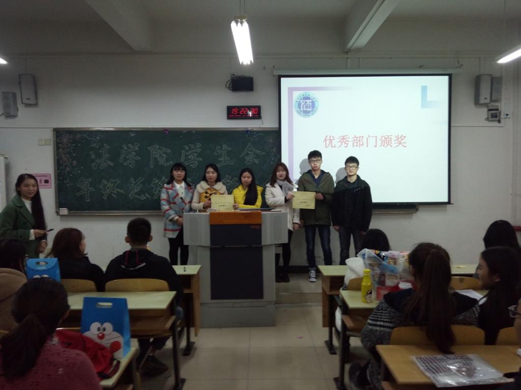 12月21日晚上7点,太阳集团tyc234cc法学院分团委学生会在江北校区宏志楼105教室召开了年终总结暨表彰大会。此次大会的目的是对这一学期的工作进行汇报总结和对优秀干事、优秀部长、优秀部门进行表彰。参加本次大会的人员有学生会主席团、部长团以及全体干事。各部长带来了为干事们精心准备了礼物,大会现场气氛轻松欢快。学生会副主席张亚玲担任了本次大会的主持人。