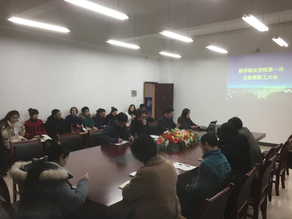 2017年2月24日下午,法学院全体教职工在慧智楼90429学院会议室召开本学期第一次会议,会议由法学院党总支书记李自维教授主持。