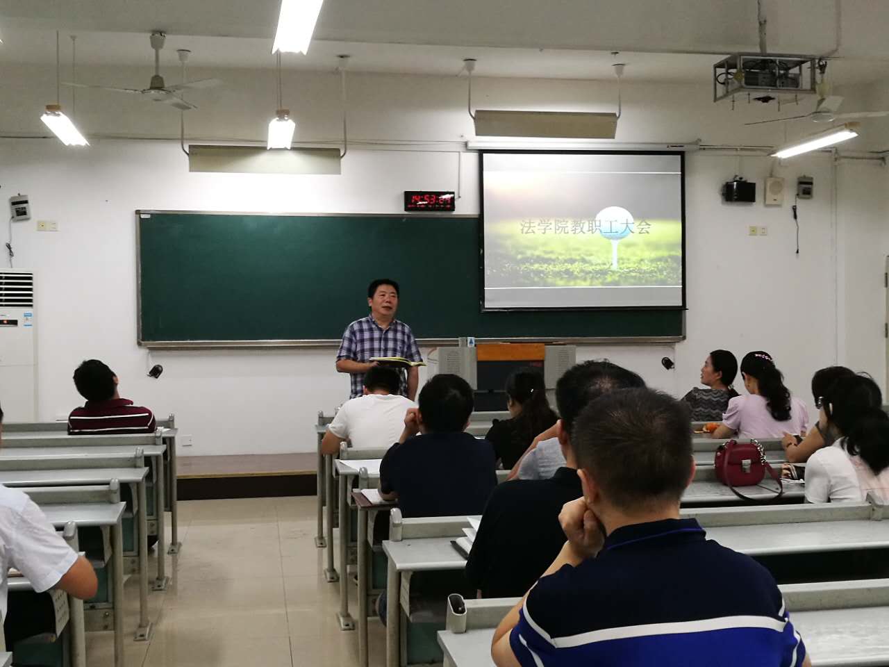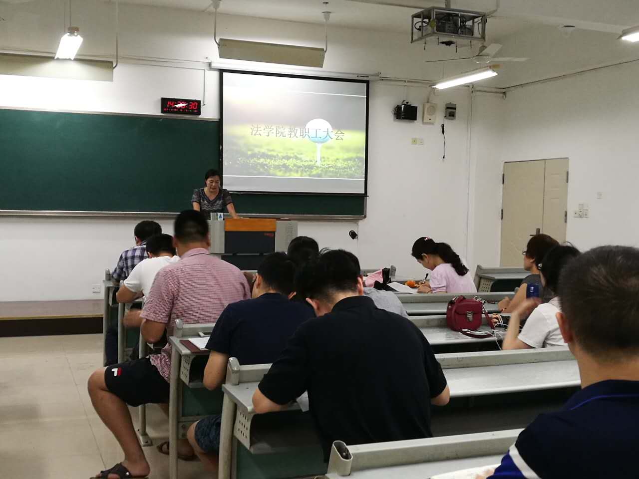 2017年8月25日,法学院在慧智楼90321教室召开全院教职工会议,对暑假期间学院进行的各项工作进行回顾以及期末预评估专家反馈情况进行了整改。