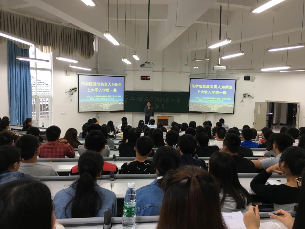 罗观老师主持了本次活动。首先由我院党总支书记李自维教授致辞,李书记在讲话中表达了对同学们的殷切期望,希望同学们牢记我院“崇法明德,卓思睿行”的院训,用实际行动将其传承;随后,法学院院长杨和义教授强调在大学生活中,同学们要坦诚做人、诚实做事,在实践中不断摸索学习方式,善于运用思辨之方法,并鼓励同学们积极利用我院学习资源;接下来我院党总支副书记简福平博士发表讲话,简书记表达了在今后的学习中为大家服务的愿望,鼓励同学们勇敢追求梦想;我院副院长刘勇教授在随后的讲话中指出,希望同学们树立对法学专业的信心,保持学习兴趣,并鼓励同学们积极参加科研活动,为今后的工作打下良好的基础。随后,我院各部门负责老师介绍了自己所负责工作的主要内容及联系方式,希望在今后的学习中为同学们提供帮助。最后法学系主任马迅博士与知识产权系主任张琨蓓分别为法学系与知识产权系新生进行专业教育。