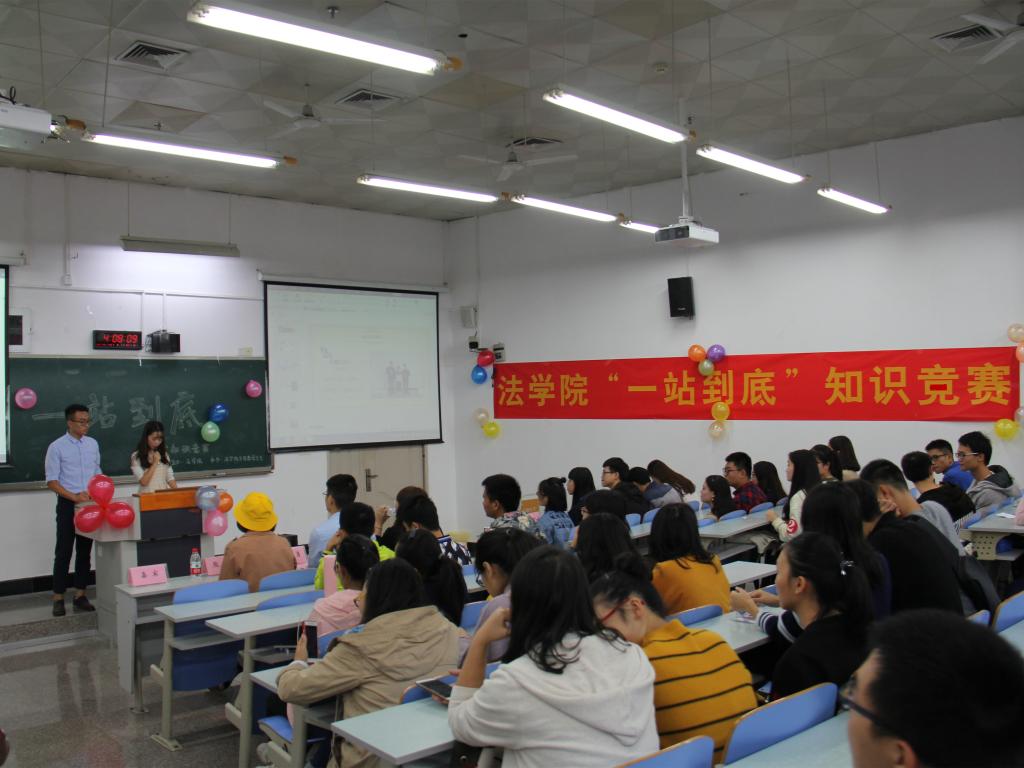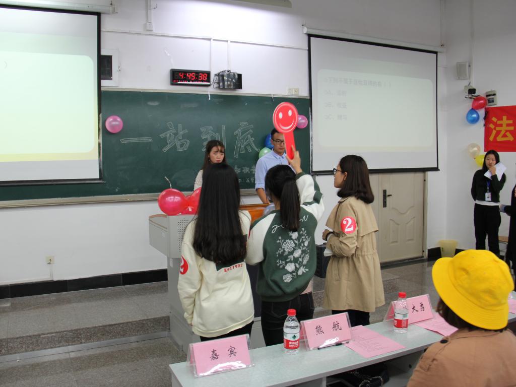 为深入学习贯彻十九大精神,弘扬法学院的学院文化,也为了开拓同学们视野,丰富同学们的课余生活,太阳集团tyc234cc法学院特举办“一站到底”法律知识竞赛活动,期望以趣味比赛的形式为同学们提供展现自我的机会,提高同学们的综合素质。本次活动于2017年11月10日下午四点在我校南岸校区慧智楼90309教室举行。部长韦苗朦与干事陈江涛担任此次活动主持人。