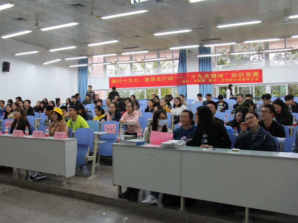 出席本次活动的嘉宾有14级法学院分团委学生会主席许大勇、法学院分团委学生会副书记成涛、学生会主席黎娜及副主席熊航、邓馨纯、胡瑞。本次知识竞赛分为初赛与决赛,比赛的题目主要涉及十九大主题内容和的法律知识。此次活动共有八支队伍参赛,每支参赛队由三人组成。初赛分为120秒作答与抢答环节两个环节,初赛中,八只队伍全神贯注答题,每队的各位选手也聚精会神,奋力思考,充分地发挥了自己的聪明才智与学术知识,各队员之间团结一致,配合默契。在抢答环节,各队伍迅速审题,动作敏捷举起作答牌,回答问题,不甘示弱,初赛结果有六支队伍晋级到最后的决赛。决赛分为三个环节,比赛的竞争在决赛中越发激烈,各队都实力不相上下,在一番比拼之后,比赛结果在众人瞩目之中揭晓:五组荣获冠军,一组夺得亚军,七组获得季军。最后许大勇学长就本次活动的组织开展情况进行了详细的点评,并表达了对法学院学生会的无限期望。