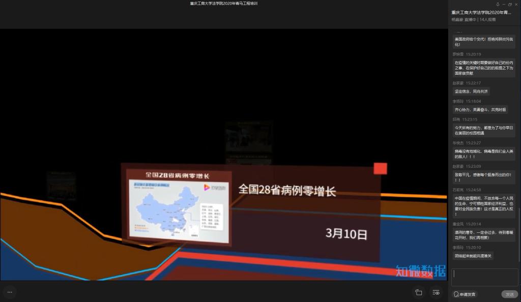 通过线上平台开展主题讲座,是一种新的尝试,也是一个新的挑战。何祖润老师代表学院分团委对培训班的开班表示热烈祝贺。她指出,参加此次培训的团员骨干应该珍惜学习机会,坚定理想信念、练就过硬本领、勇于创新创造、矢志艰苦奋斗、锤炼高尚品格,在弘扬和践行社会主义核心价值观中勤学修德、明辨笃实,爱国励志、求真力行,以实际行动践行跟党走的理想追求。值此举国上下共抗疫情之际,作为学生干部,更应该在这场“战役”的关键时刻践行青年团员的使命担当,积极作为,率先垂范,在广大学生中主动发挥先锋模范作用,带头配合国家、社会、学校的防疫工作,做到不信谣、不传谣,在保护好自身安全的同时为防疫攻坚战贡献自己的力量。此次培训结合了防疫期间青年大学生的思想动态,通过播放战“疫”视频——《全民战“疫”史--回顾这场历时108天的战役》,引用案例进行交流讨论,将枯燥的理论变得生动活泼,既启发了学员的独立思考,又更加坚定了青年团员的理想信念。