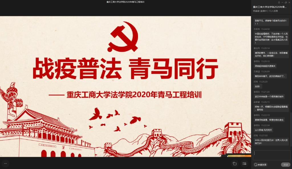 勇担青春使命,积极投身战疫。为贯彻落实全国高校思想政治工作会议精神,切实加强对青年团员的思想引领,深入贯彻落实“青年马克思主义者培养工程”相关要求,法学院分团委于3月20下午14:30通过企业微信平台为“青马工程”培训班学员开展了线上主题讲座。培训班由法学院分团委副书记何祖润老师主持,学院分团委全体学生干部参加了本次培训班。