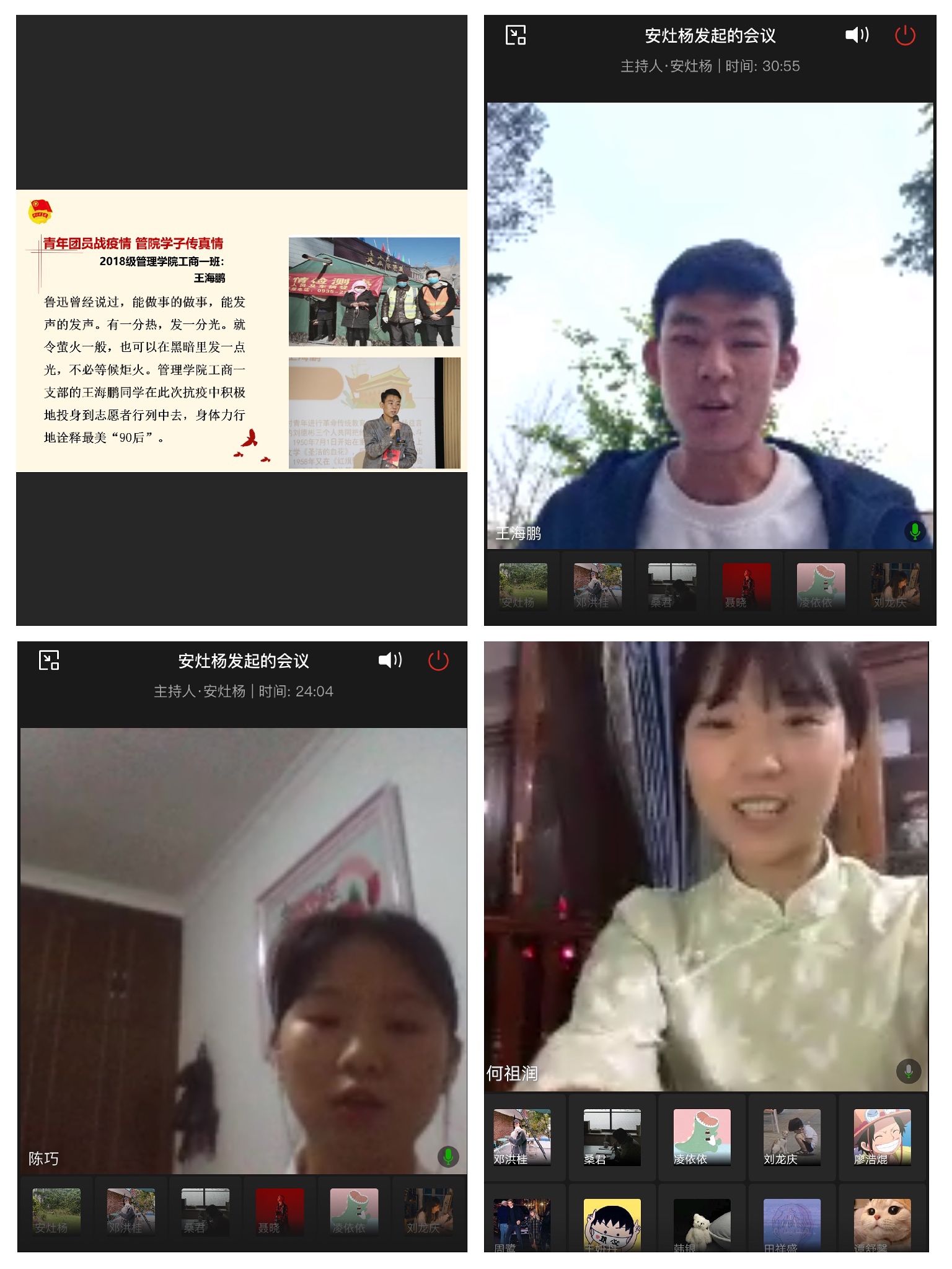 法学院2017级、2018级各团支部也在团支书的带领下陆续开展了纪念五四运动系列线上主题团日活动。通过这样的形式进一步增强了同学们战胜疫情的信心和决心,深刻认识到了作为新时代的青年团员在弘扬爱国主义和五四精神中的表率作用,鼓励大家积极参与到家乡的志愿服务工作中去,为家乡建设出一份力,发一份光。