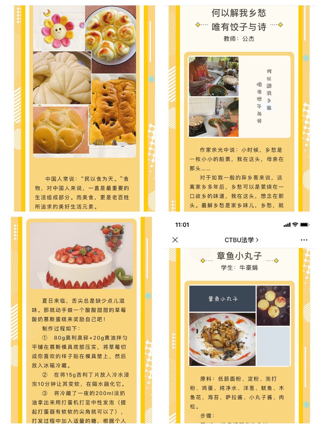 学生赛区,经典欧包、草莓酸奶慕斯蛋糕、芝士抖臀蛋糕等烘培作品层出不穷;水煮肉片、黄焖鲫鱼、香辣虾等经典菜肴令人垂涎欲滴;葡式蛋挞、章鱼小丸子等街头小吃霸占屏幕……一道又一道的精美菜肴和居家收纳妙招充分展示了法学学子的动手能力和生活智慧。