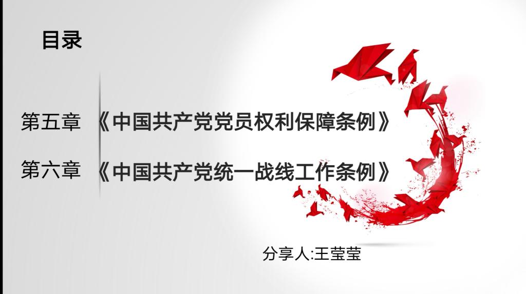 其次,王莹莹同志详细领学了《中国共产党党员权利保障条例》《中国共产党统一战线工作条例》,让党员同志们进一步加强了对党有关知识的学习,进一步明确了党员的权利与义务,进一步保持了党员思想的纯洁性。