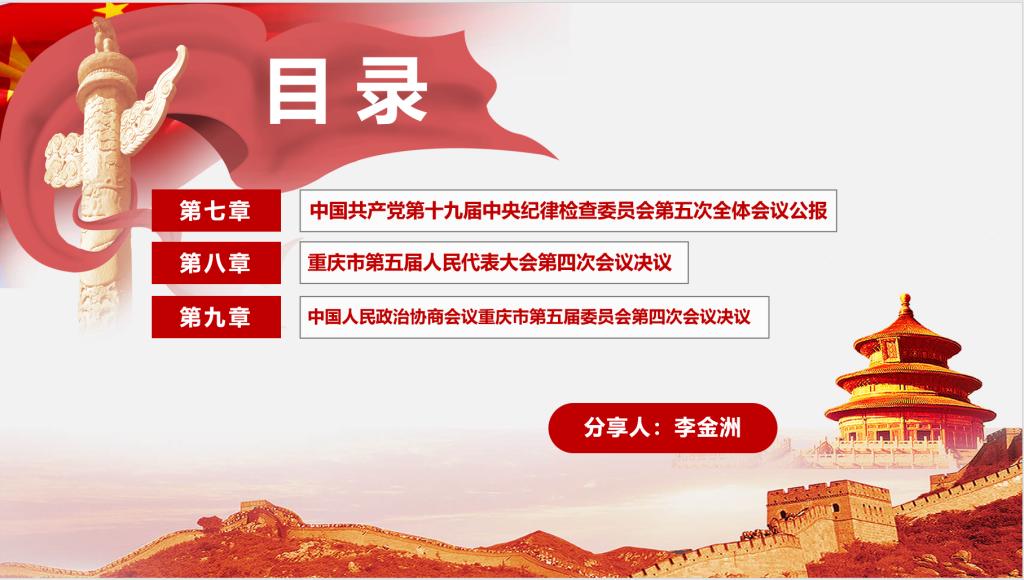 然后,李金洲同志分享了“中国共产党第十九届中央纪律检查委员会第五次全体会议公报” “重庆市第五届人民代表大会第四次会议决议” “中国人民政治协商会议重庆市第五届委员会第四次会议决议”等内容,并从时间上对当前的一些重要会议安排进行了梳理。