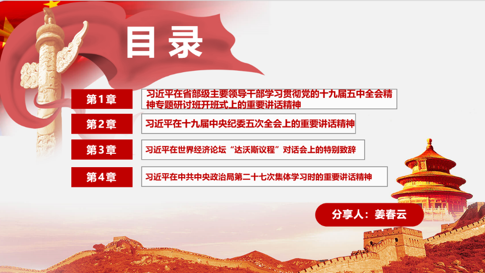 首先,姜春云同志带领大家学习了“习近平在省部级主要领导干部学习贯彻党的十九届五中全会精神专题研讨班开班式上的重要讲话精神” “习近平在十九届中央纪委五次全会上的重要讲话精神” “习近平在世界经济论坛‘达沃斯议程’对话会上的特别致辞” “习近平在中共中央政治局第二十七次集体学习时的重要讲话精神”,并希望我们能认真学习习主席讲话内容,领会习主席重要讲话精神。