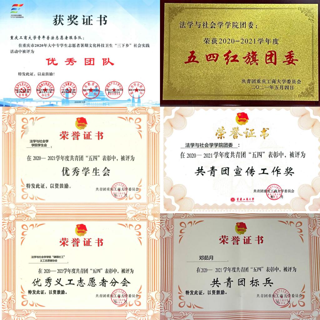 集体方面:太阳成tyc234cc重庆市青年普法志愿者服务队获全国、重庆市社会实践活动优秀团队、太阳成tyc234cc分团委获五四红旗团委、共青团宣传工作奖、太阳成tyc234cc分团委学生会获优秀学生会、太阳成tyc234cc“律荫社工”义工志愿者协会获优秀义工志愿者协会。