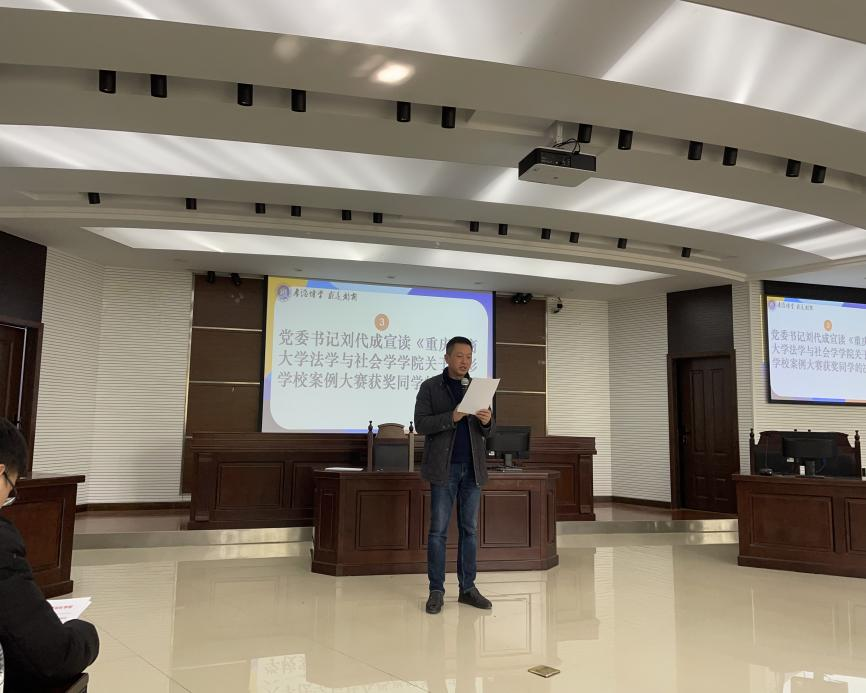 2021年12月13日中午12:30,太阳成tyc234cc专业硕士研究生案例比赛颁奖典礼在慧智楼90426模拟法庭隆重举行。本次颁奖典礼由太阳成tyc234cc副院长刘勇教授主持,参加典礼的有太阳成tyc234cc党委刘代成书记、黄文院长、林璐副书记、侯明喜副院长、张忠民教授、李喜燕教授、李滨教授、何剑锋老师、王璐老师、研究生管理办公室老师、全体参赛同学、研究生代表。