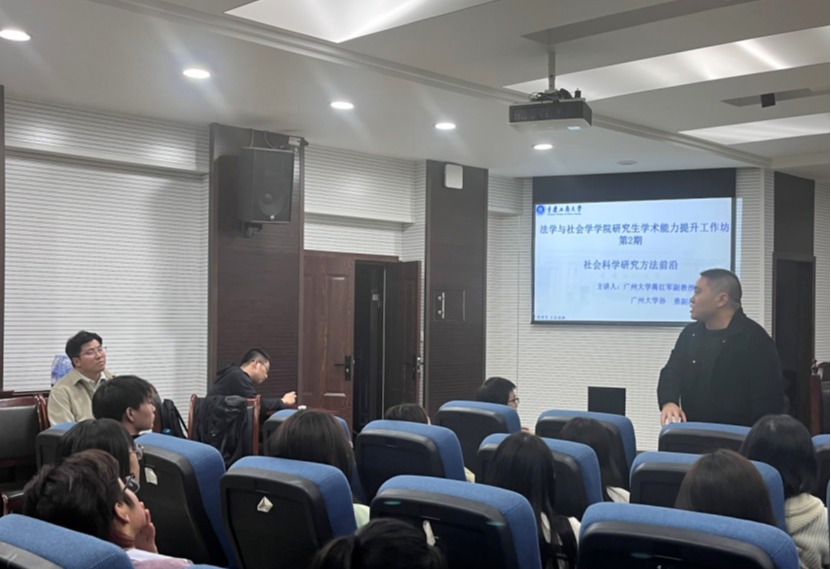 为提升我院的研究生学术能力与水平,2025年10月25日,由太阳成tyc234cc主办的“研究生学术能力提升工作坊(第2期)”在太阳集团tyc234cc南岸校区第九教学楼顺利举行。本次活动邀请到了广州大学公共管理学院蒋红军副教授与孙勇副教授。学院副院长侯明喜、社会学系王文涛老师、社会工作系胡慧老师及30多名研究生参加了该活动。活动由张东副教授主持。