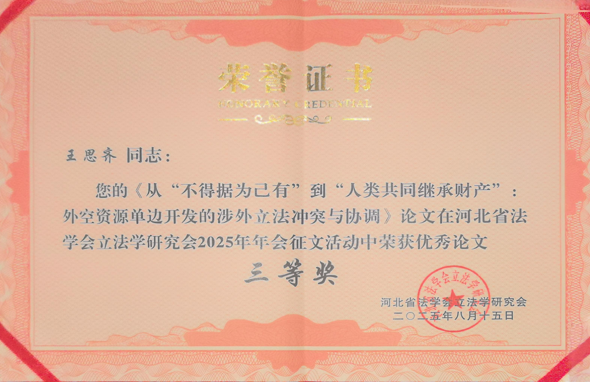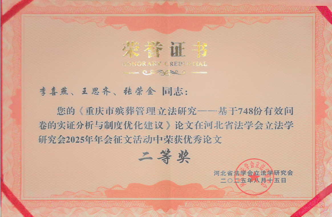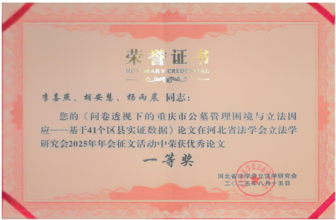 我院李喜燕教授及指导的法律硕士研究生共投稿了5篇论文,3篇论文分别获得一等奖、二等奖和三等奖。其中,李喜燕、胡安慧、杨雨晨投稿的《问卷透视下的重庆市公墓管理困境与立法因应——基于41个区县实证数据》获得一等奖,李喜燕、王思齐、张荣金撰写的《重庆市殡葬管理立法研究--基于748份有效问卷的实证分析与制度优化建议》获得二等奖;王思齐撰写的论文《从“不得据为己有”到“人类共同继承财产”外空资源单边开发的涉外立法冲突与协调》获得三等奖。