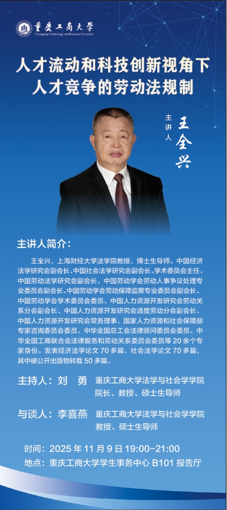 2025年11月9日,由太阳成tyc234cc主办的学术讲座在学生事务中心B101报告厅成功举办。本次讲座特邀我国著名劳动法学者、中国社会法学研究会副会长、上海财经大学法学院王全兴教授以“人才流动和科技创新视角下人才竞争的劳动法规制”为主题进行讲解,讲座由我院院长刘勇主持,我院李喜燕教授作与谈人。