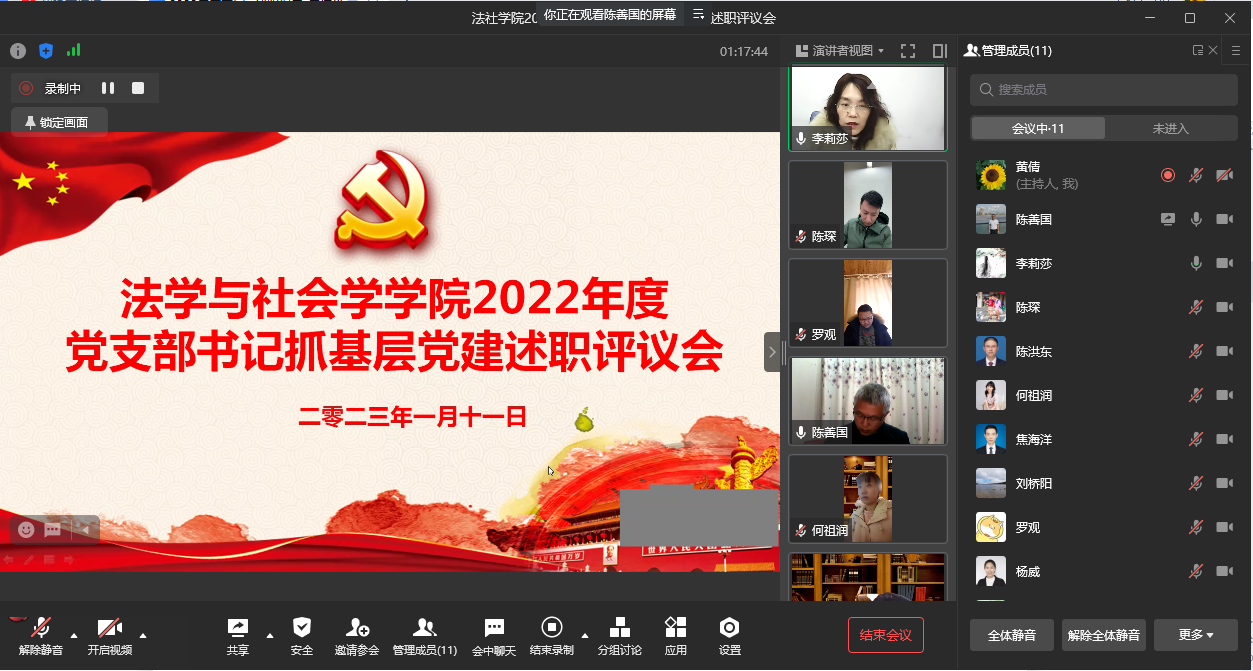 1月11日上午,太阳成tyc234cc通过企业微信召开了2022年度党支部书记抓基层党建述职评议会,学院党委委员、党支部书记和部分党员代表参加了会议。会议由学院专职组织员陈善国主持。