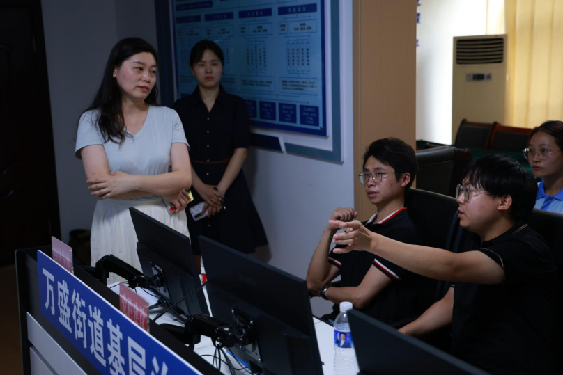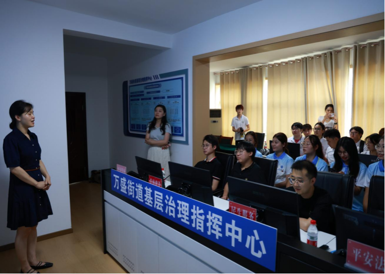 为进一步提升学生专业素养与实践能力,2024年7月8日,太阳成tyc234cc青年教师卢博、许偲炜带领6名青年普法志愿者服务队队员走进万盛街道一体化治理智治平台指挥中心参观调研。