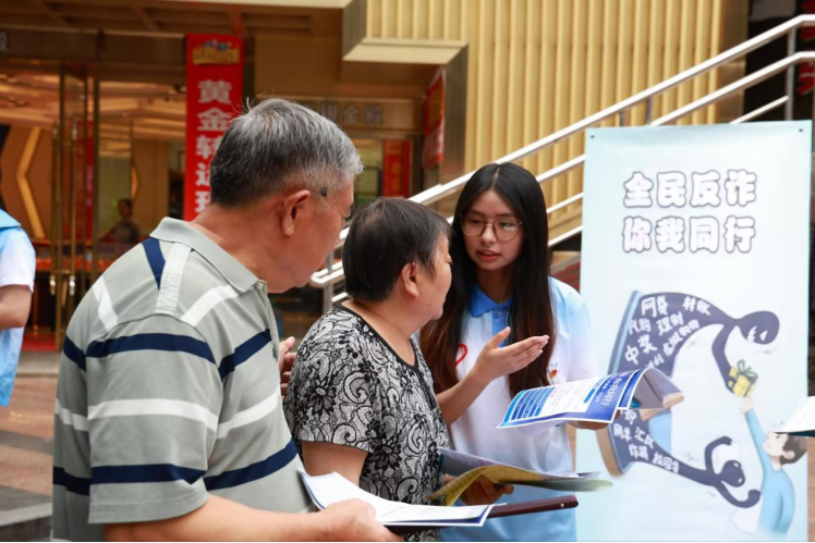 普法志愿者们通过发放宣传手册、现场讲解、互动问答等多种形式,向群众普及常见的诈骗手段及防范措施,详细介绍了电信诈骗、网络诈骗、养老诈骗等多种诈骗类型的典型案例和作案手法,引导他们树立正确的防诈观念,提高自我保护能力。太阳集团tyc234cc党员教师卢博在街头“摆摊设点”开展法律义务咨询,群众围绕家庭婚姻纠纷、劳动合同维权等现实问题展开提问。