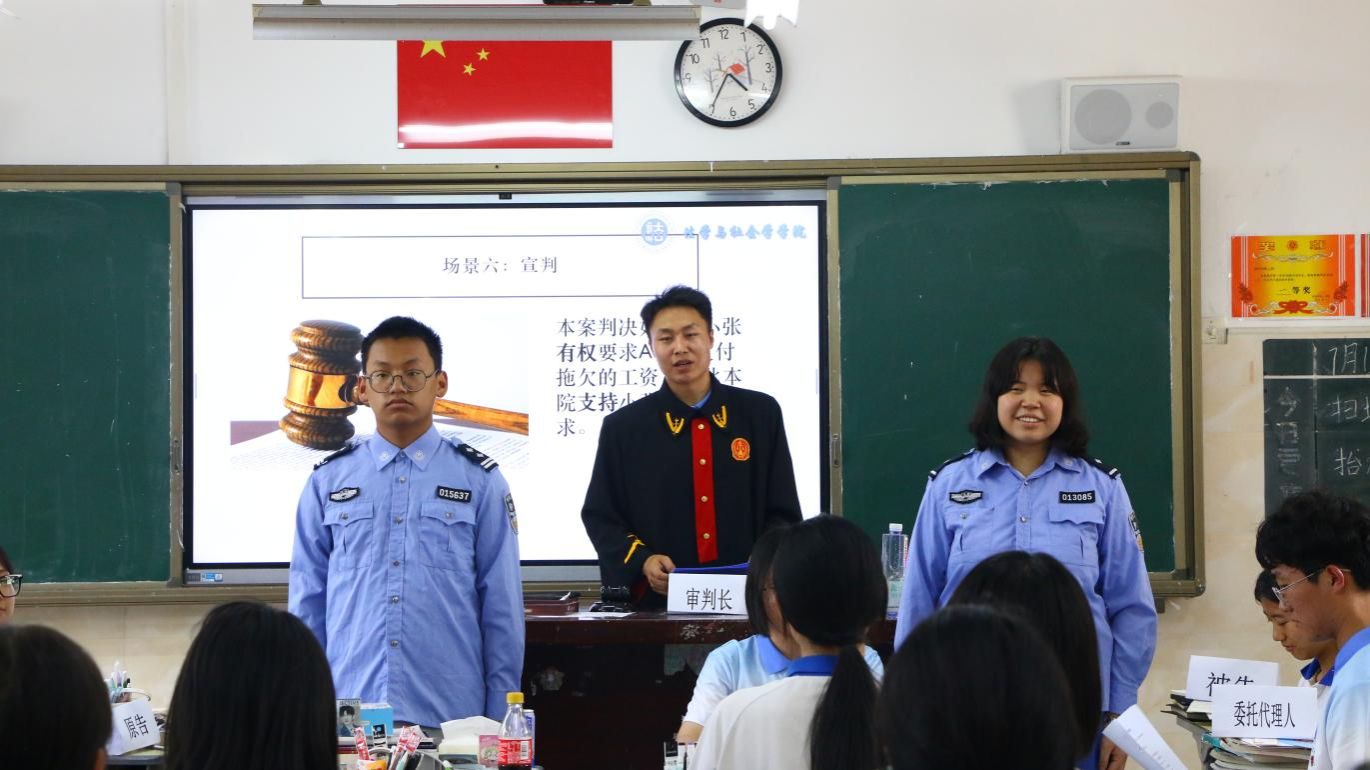 “咚……”随着威严庄重的法槌声响起,一起青少年药物滥用的模拟庭审案件正式“开庭”。庭审过程中,4名大学生志愿者分别扮演审判长、书记员、原被告委托代理人,4名中学生分别扮演原告、被告、法警,从案件基本情况核实、法庭调查、法庭辩论到当庭宣判等环节,全方位还原庭审现场,让西昌一中的学生“零距离”感受司法审判工作。